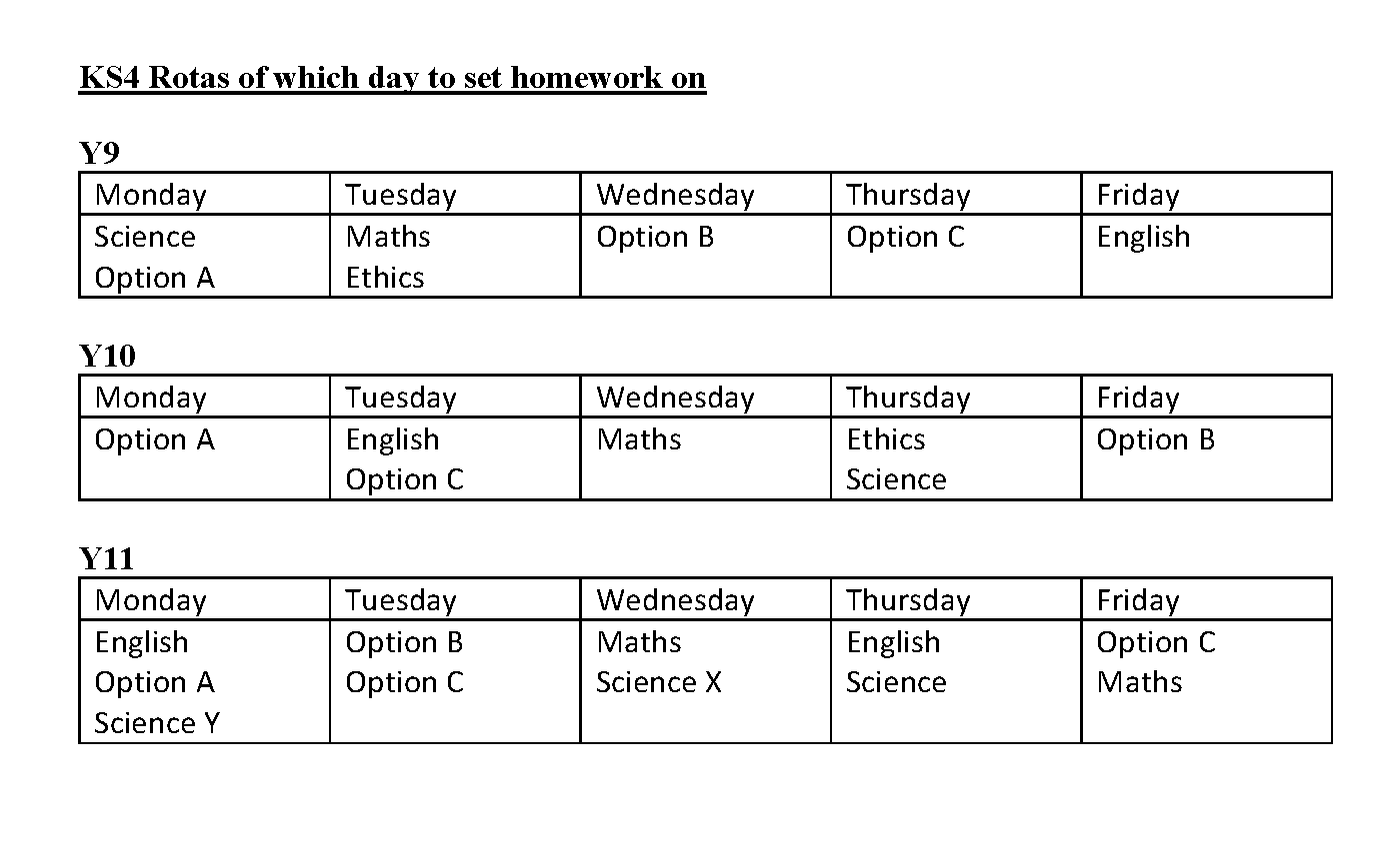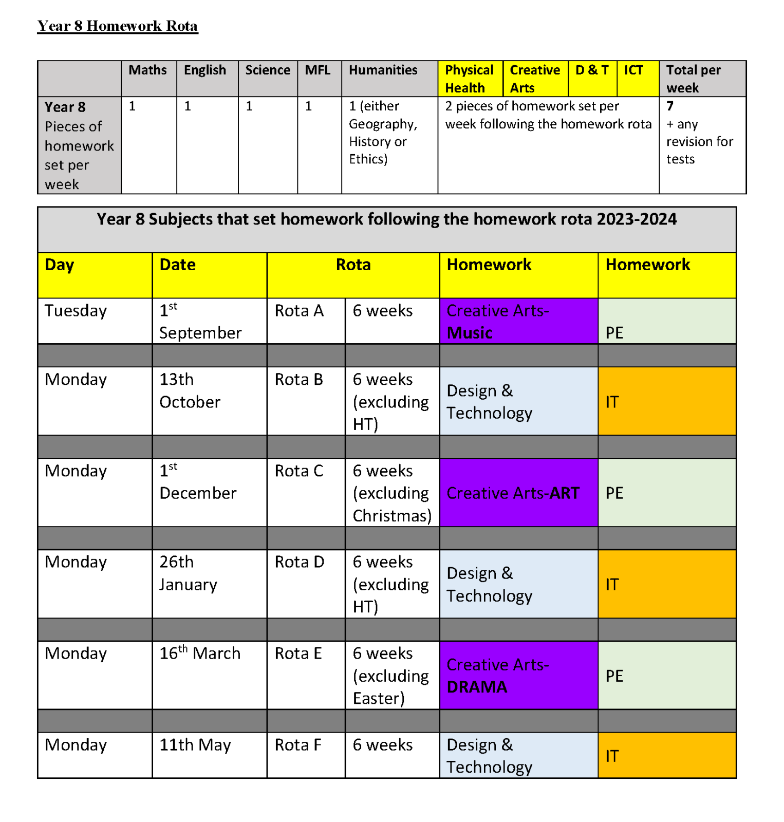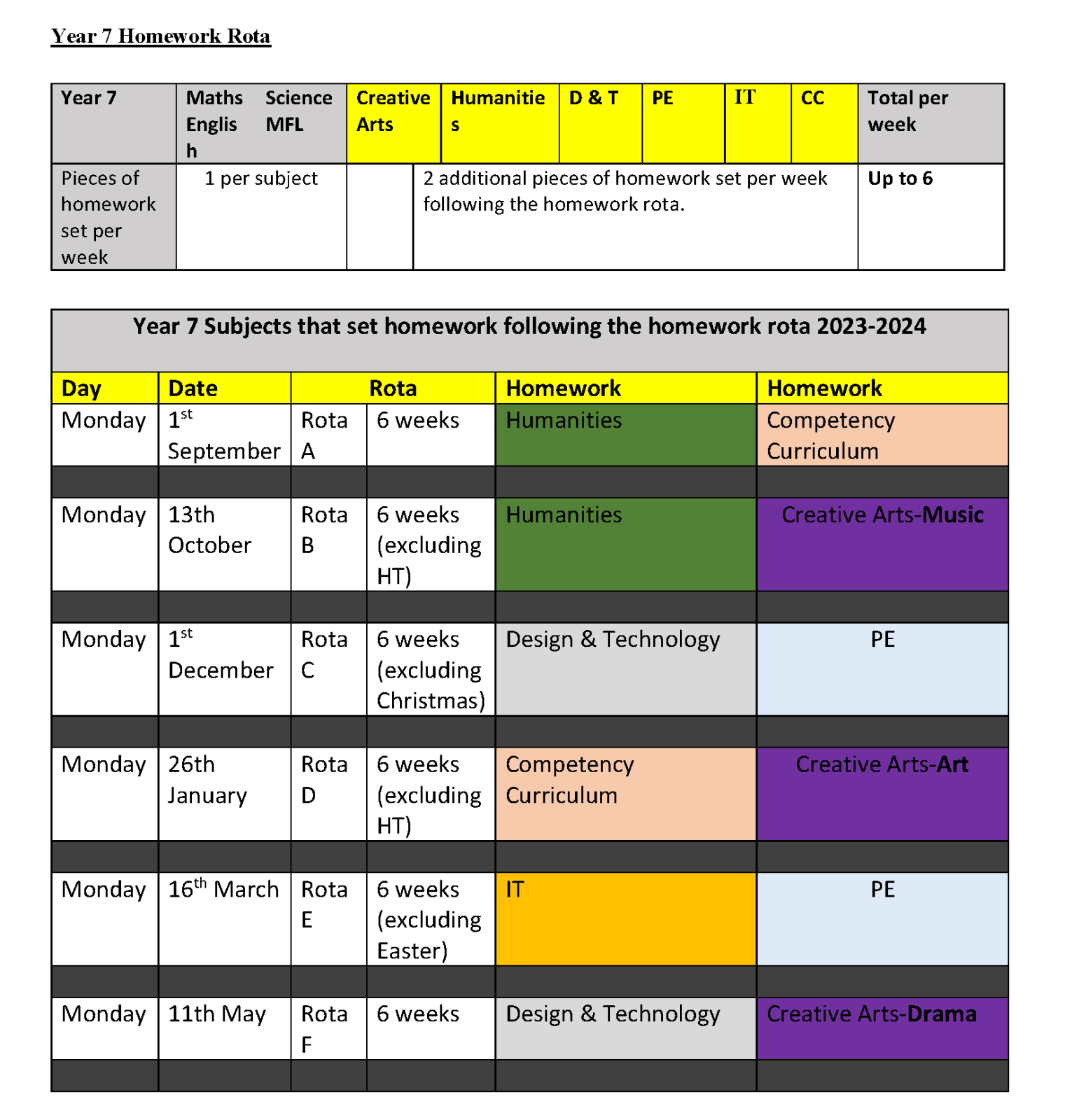 • From their remaining subjects, students will receive two additional pieces of homework. These subjects will set homework following the Year 7 homework rota: